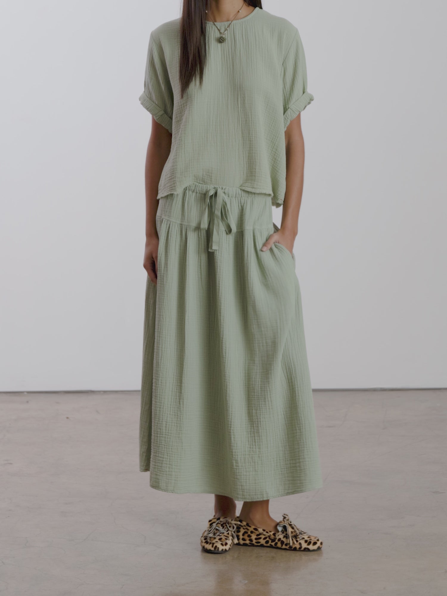 Bare Necessities. Carson is made in our washed double faced cotton gauze for a soft, gently crinkled feel. This popover top features a scoop neck, stitched rolled sleeves, and a keyhole button-back.