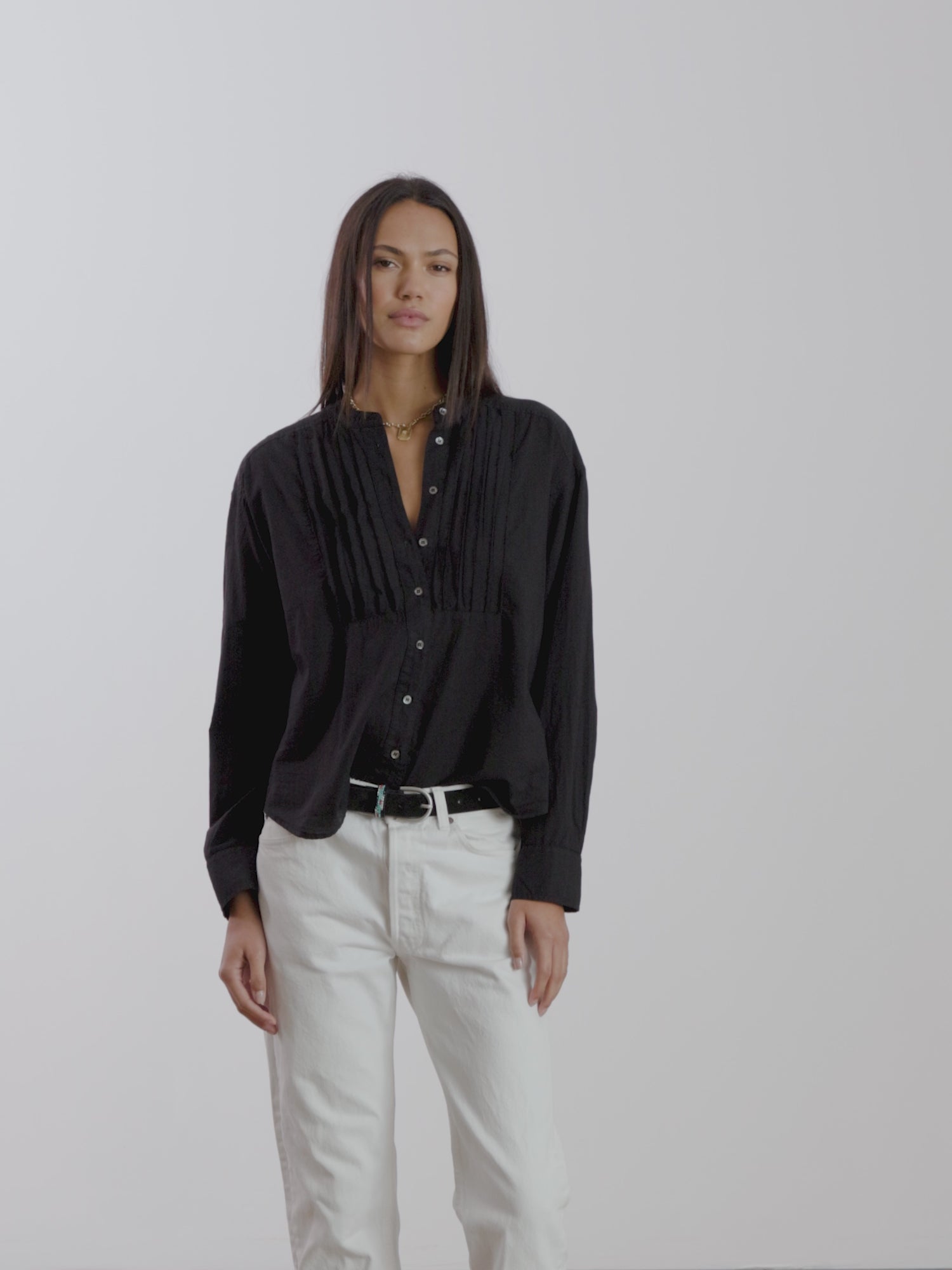 Picture Perfect. Miranda is new this season in our classic lightweight woven cotton poplin for a lived-in look and feel. This femme button-front shirt features a bib front with pintucks and a back yoke with an inverted pleat.