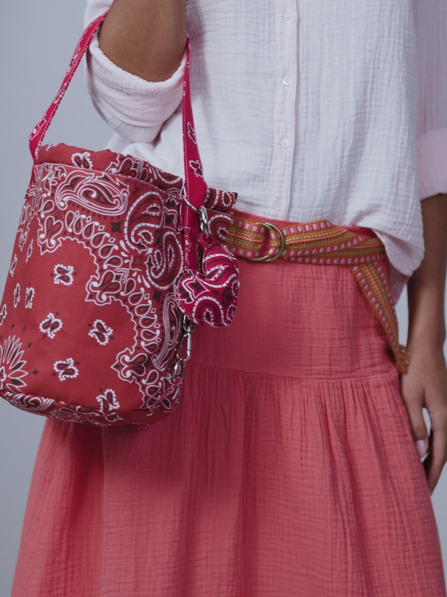Founded in 2020, CALL IT BY YOUR NAME creates artisanally crafted clothing and accessories inspired by traditional paisley print bandanas. Sourced and upcycled from authentically made bandanas, this bucket bag is hand-embroidered and features a bandana lining, adjustable strap, and snap closure.