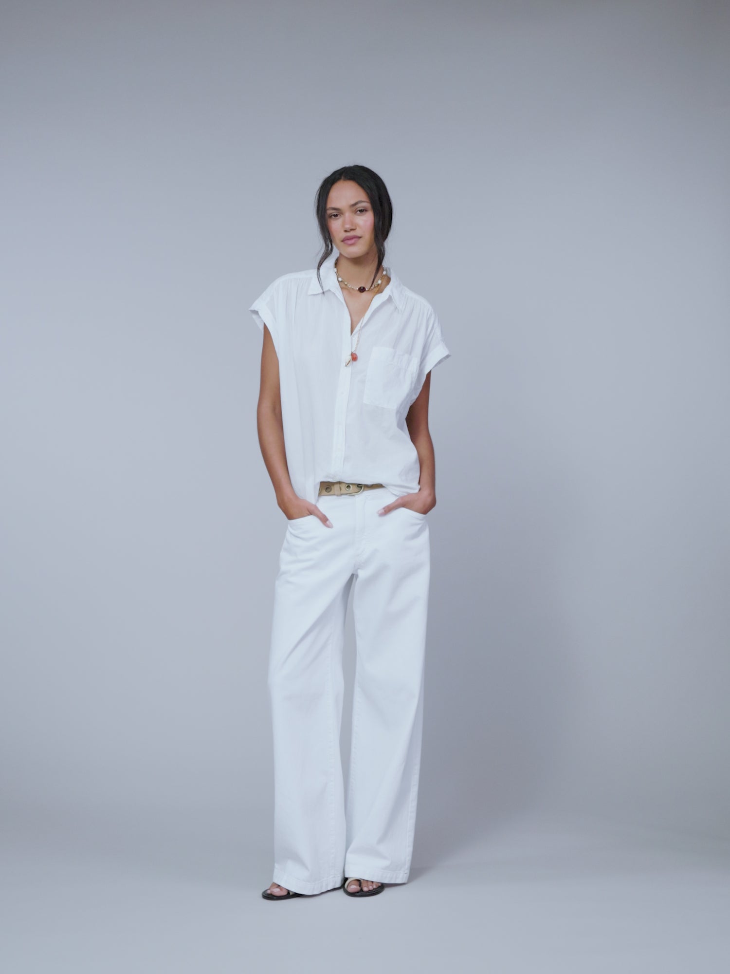 Be cool. Lexi is new this season in our classic lightweight woven cotton poplin for a lived-in look and feel. This easy button-front shirt features a left chest pocket, cap sleeves, and softly shirred shoulders and back yoke finished with a button-tab detail.